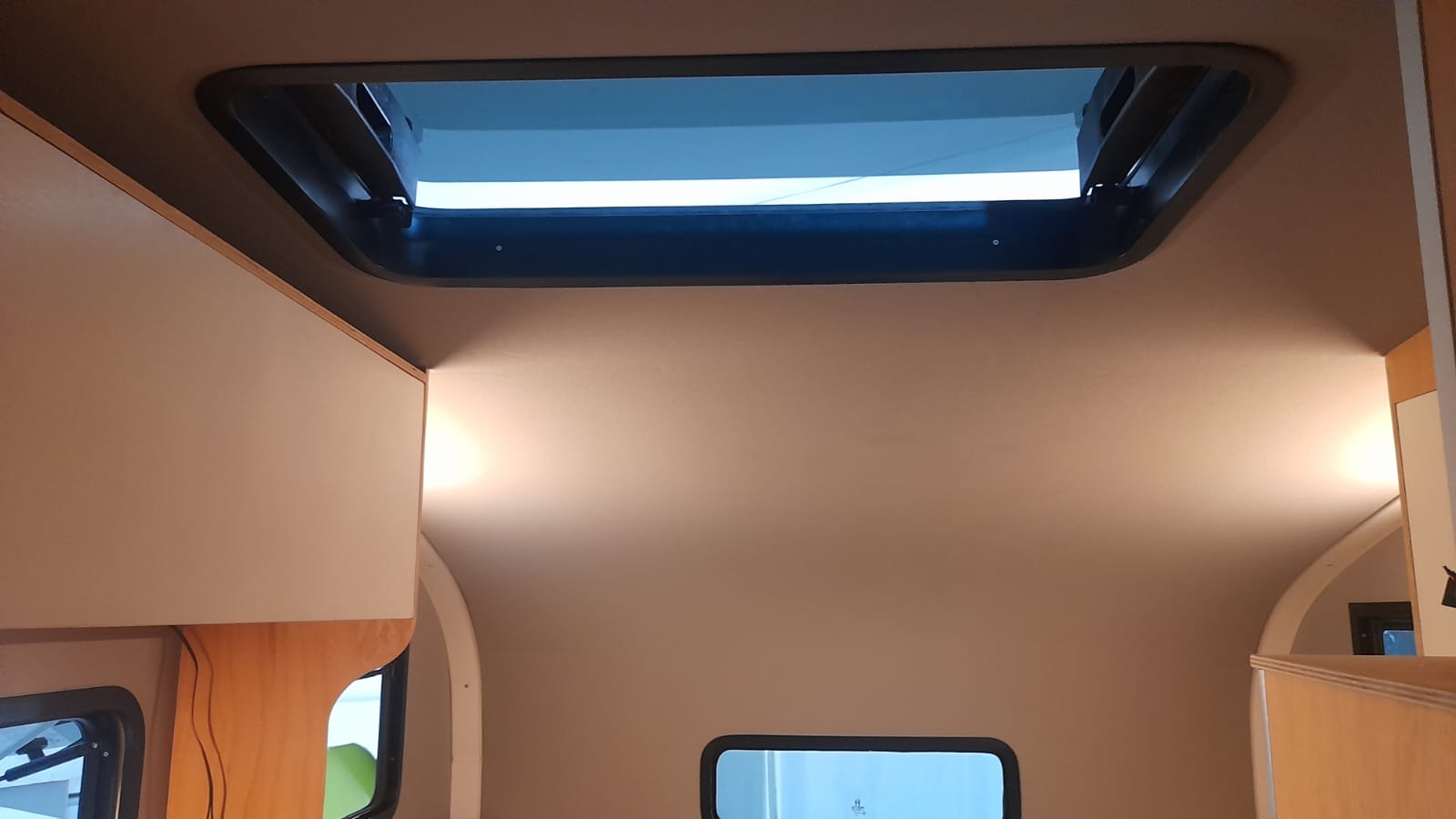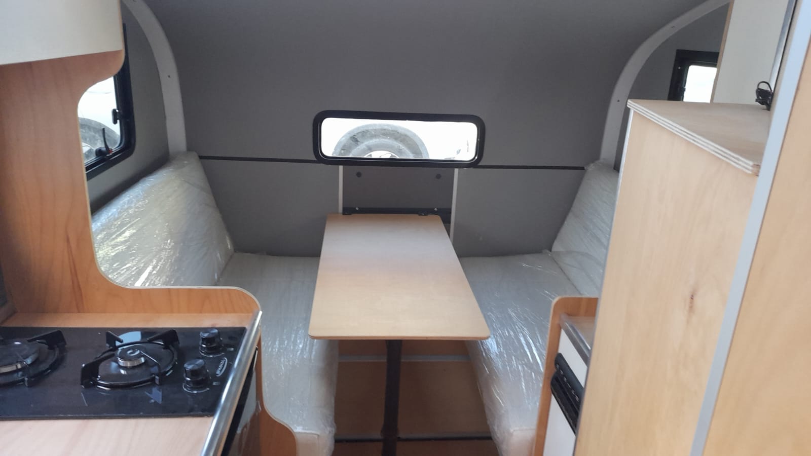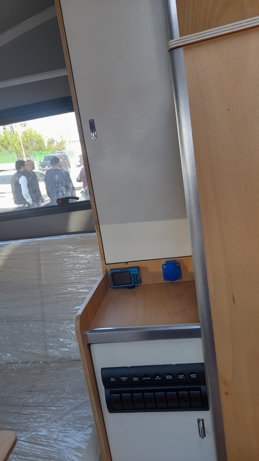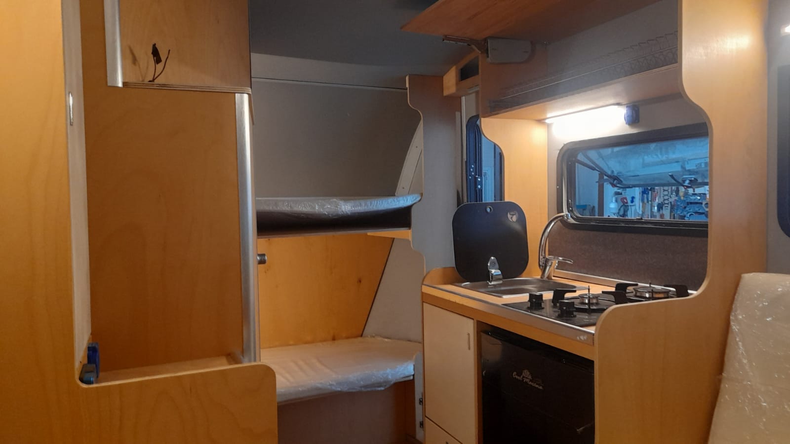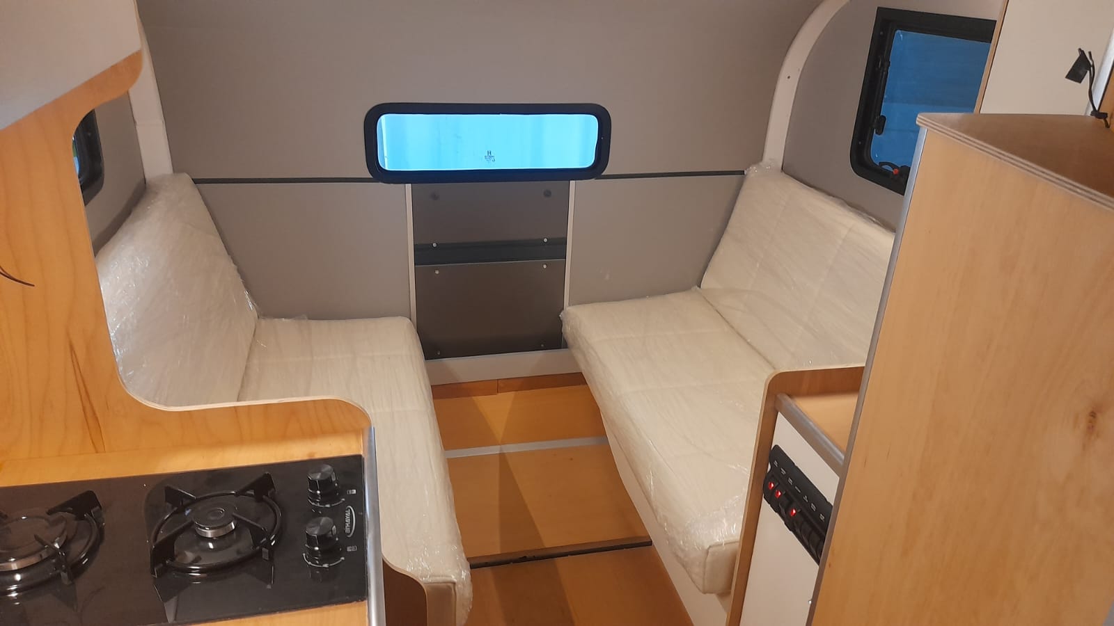 * 86 cm mutfak modülü / 50 lt 12 v buzdolabı entegre / üst dolap / 70 cm dışarı açılır mutfak havalandırma camı / 1 adet kaşık çekmecesi mutfakta 3 adet 220v priz.