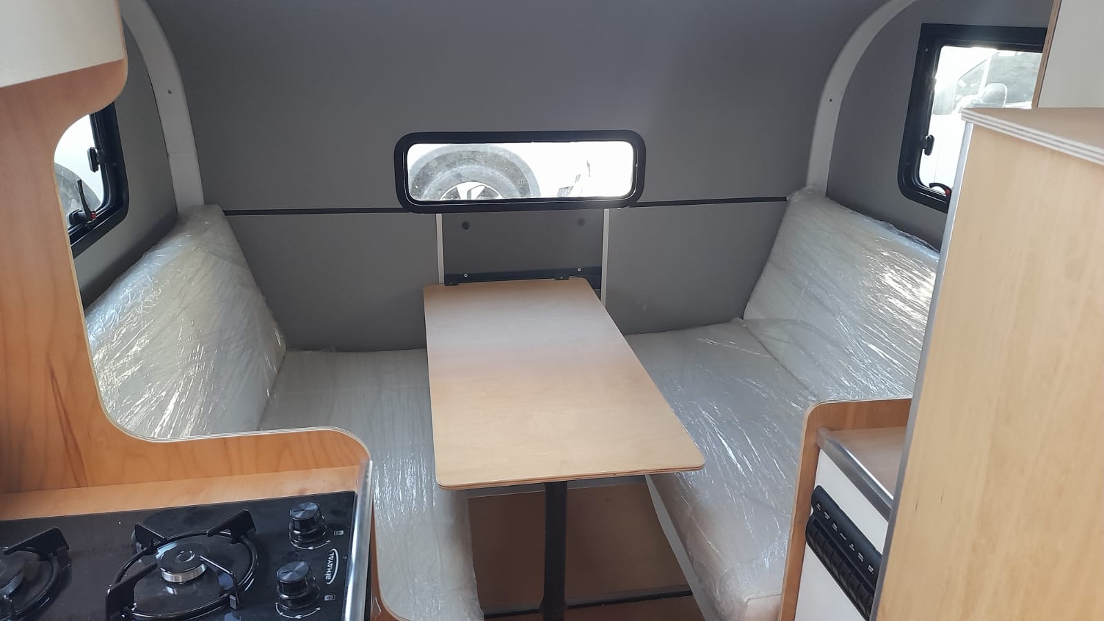 * 50x100 cm yemek masası -okume marin kontraplak - pratik bağlantılı - katlanabilir ayaklı - karavan arka duvarında yada dış yan cephelerde 3 farklı yerde kullanılabilir.